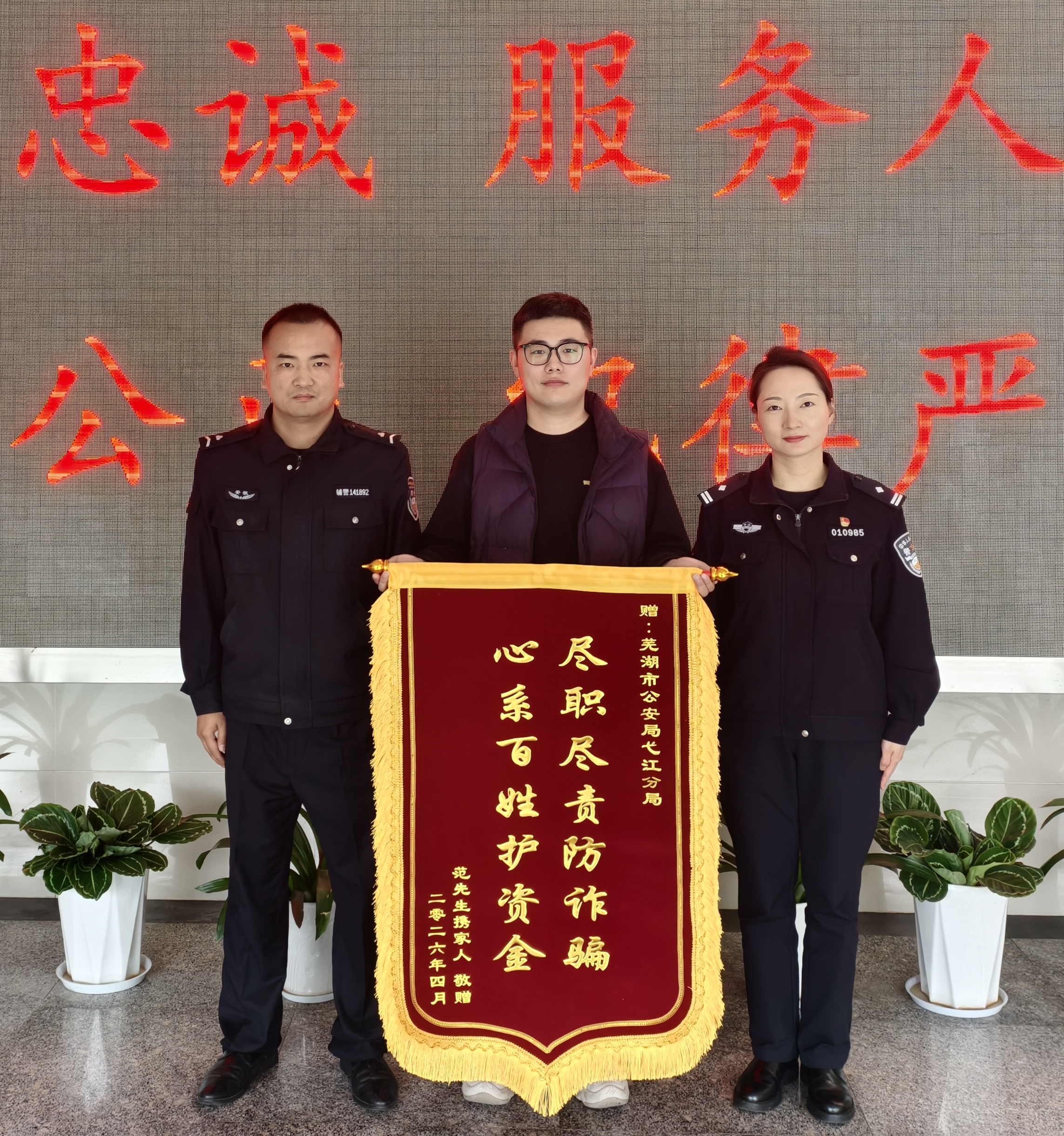 “若不是民警及时上门,我的辛苦钱就全被骗走了!”4月16日,一面印有“尽职尽责防诈骗,心系百姓护资金”的锦旗被送到芜湖市公安局弋江分局反电诈中心。送锦旗的群众家属,紧紧握住民警的...