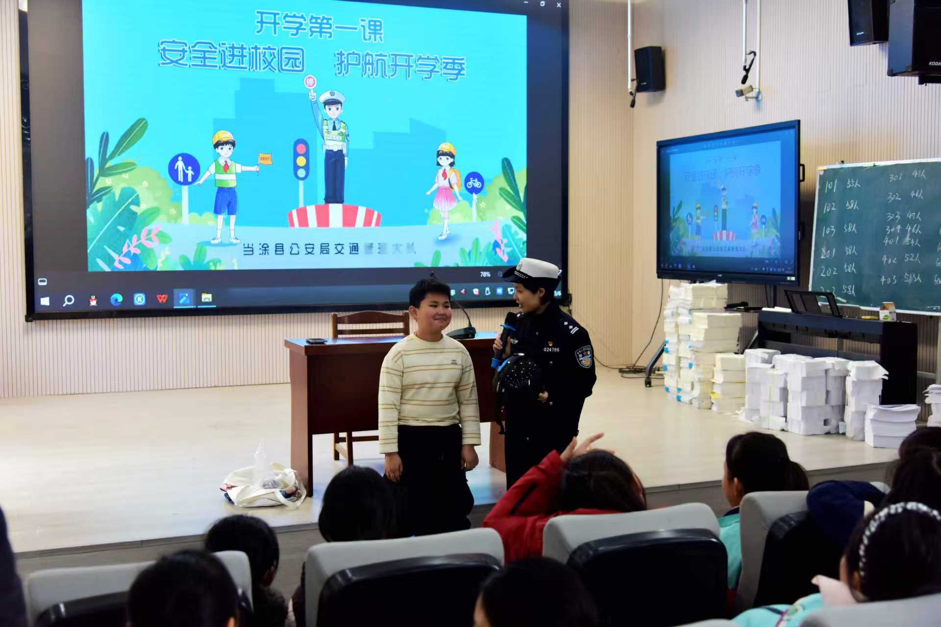 3月6日,当涂县公安局交管大队走进辖区小学开展“开学第一课”交通安全主题宣讲活动,通过案例讲解、互动问答、现场演示,向同学们普及乘车规范、“一盔一带”、车辆盲区避险等实用知识, ...