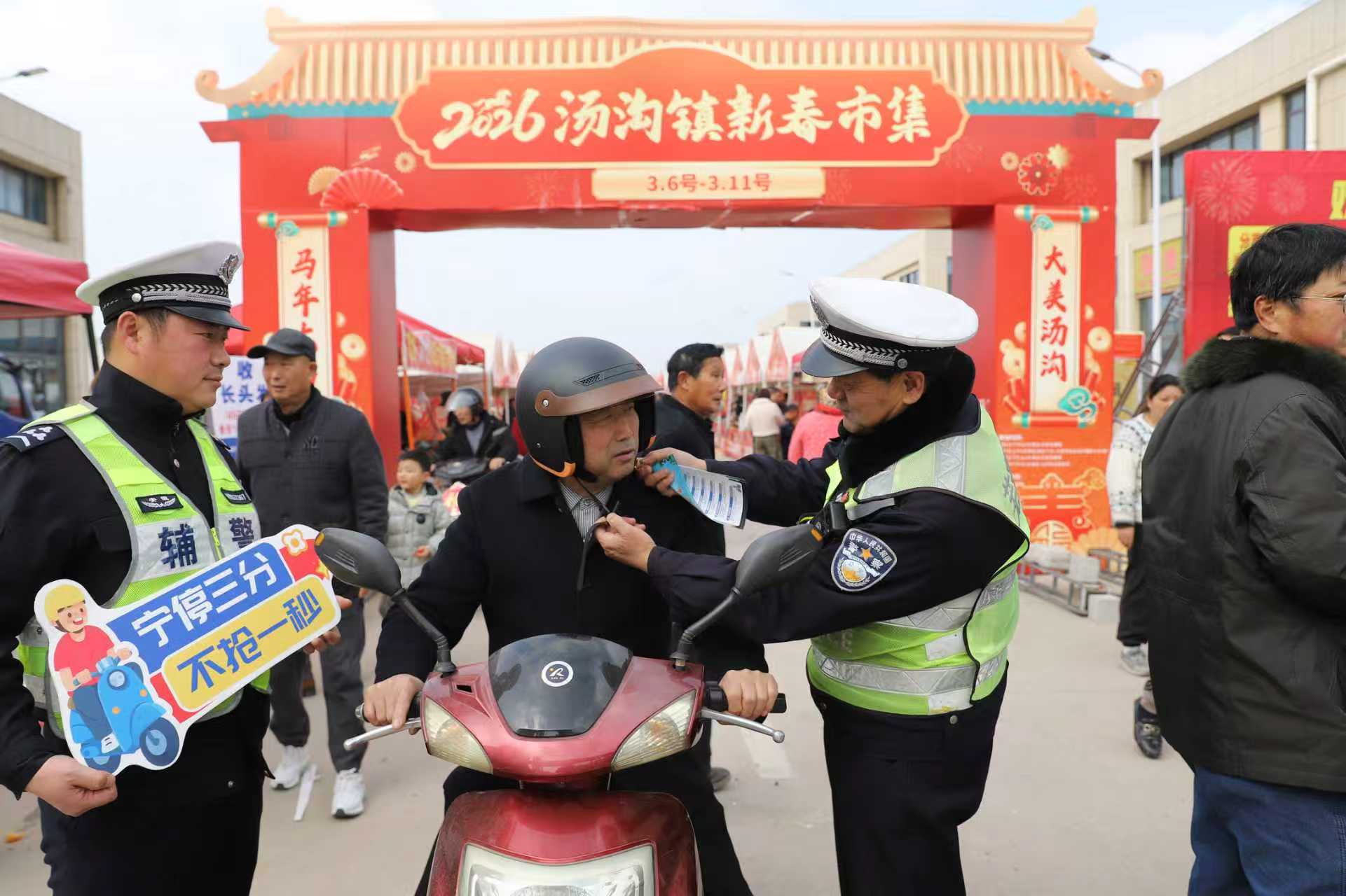 3月6日,芜湖市鸠江区汤沟镇新春市集准时开市,该市公安局交管支队鸠江大队宣传民警辅警采取宣讲、散发宣传资料等形式,向赶集市民宣传“一盔一带”等交通安全知识,守护村民平安出行。