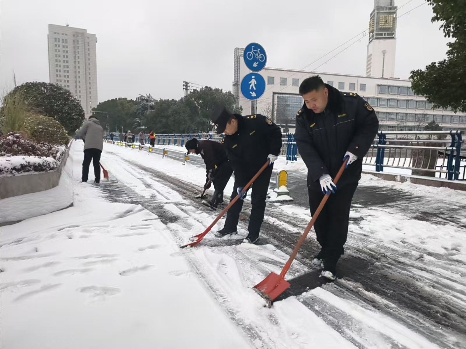20日清晨6时许,雪花纷纷扬扬飘落。在长江中路四十二中门口,环卫工人、城管队员早已有序展开清雪作业。现场一片忙碌景象——有人手持铁锹破冰铲雪,有人沿路撒布融雪剂,大家分工协作、配合紧密。