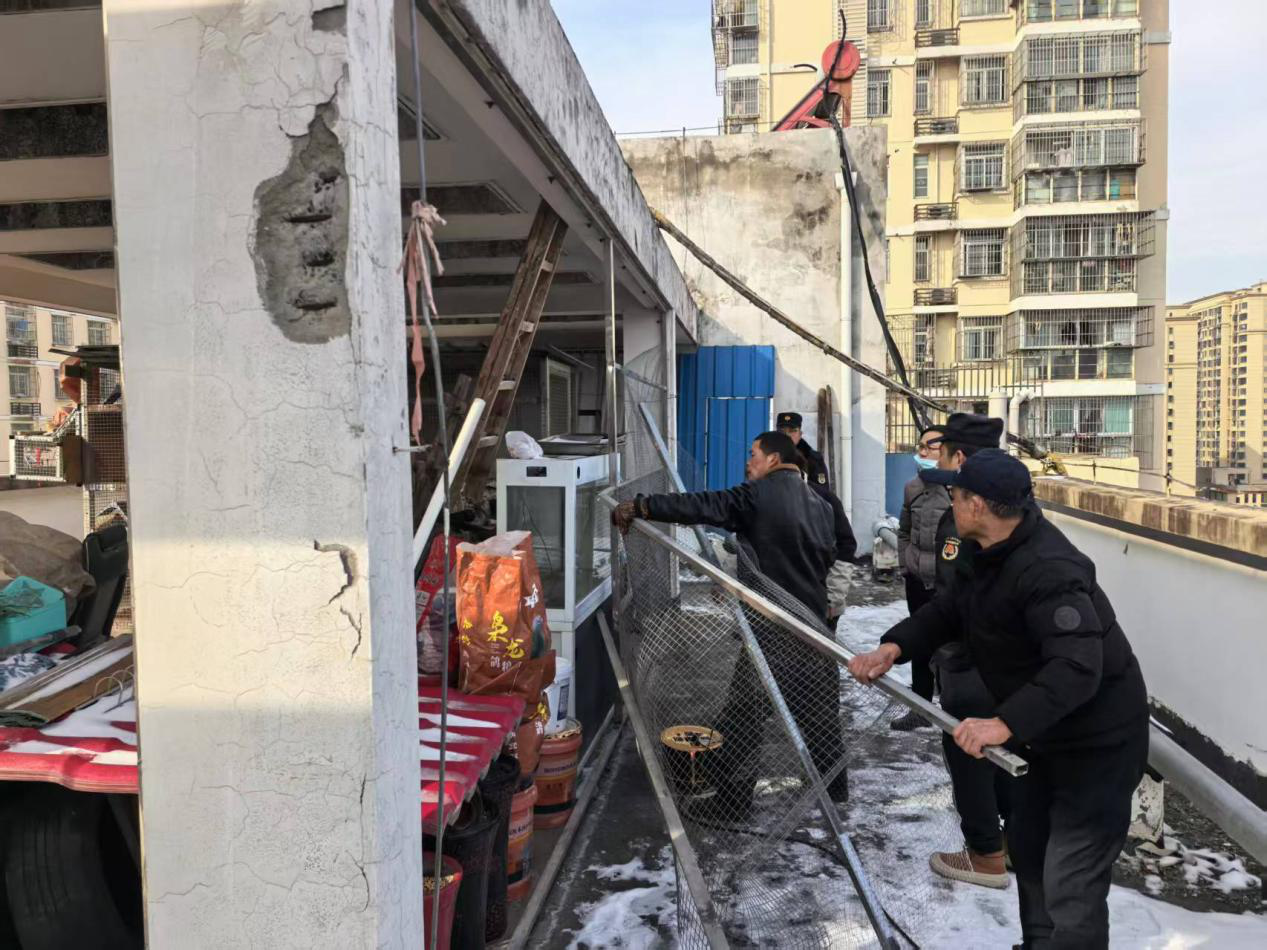拆除当日,各部门各司其职:民警划定安全警戒线,维护现场秩序、疏导围观群众;社区工作人员全程陪同业主,做好情绪疏导与沟通协调;物业清理楼顶障碍物,备足消防器材与应急物资;城管中队现场监督拆除全过程,确保施工规范安全。