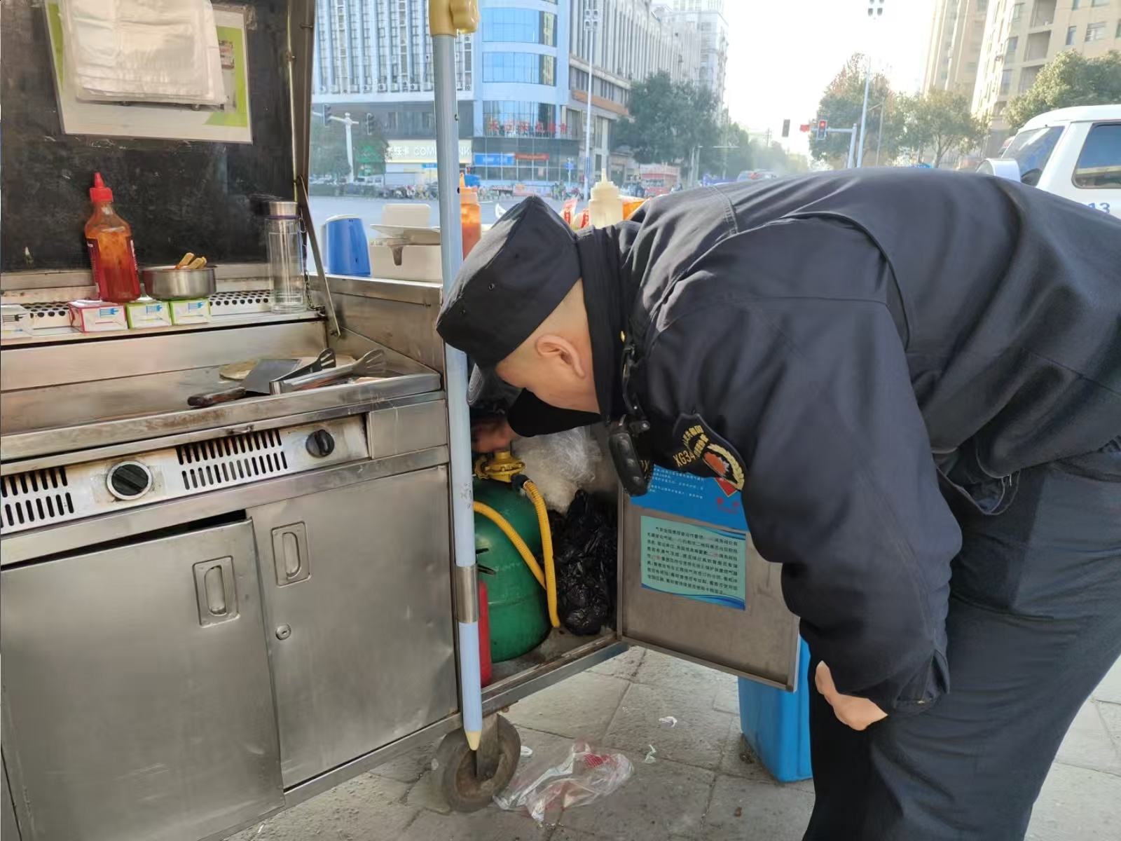 “冬季气温低,燃气罐接口易老化漏气,一定要每日检查,避免安全隐患。”在繁华大道与北京路交口附近,执法队员仔细检查早餐车的煤气罐有效期、燃气软管老化情况、灭火器配备合规性等问题,同时核实经营户持证亮证、健康证有效期及周边环境卫生状况。近一周以来,执法大队累计排查早餐车经营户30余家,发放安全宣传单页50余份。