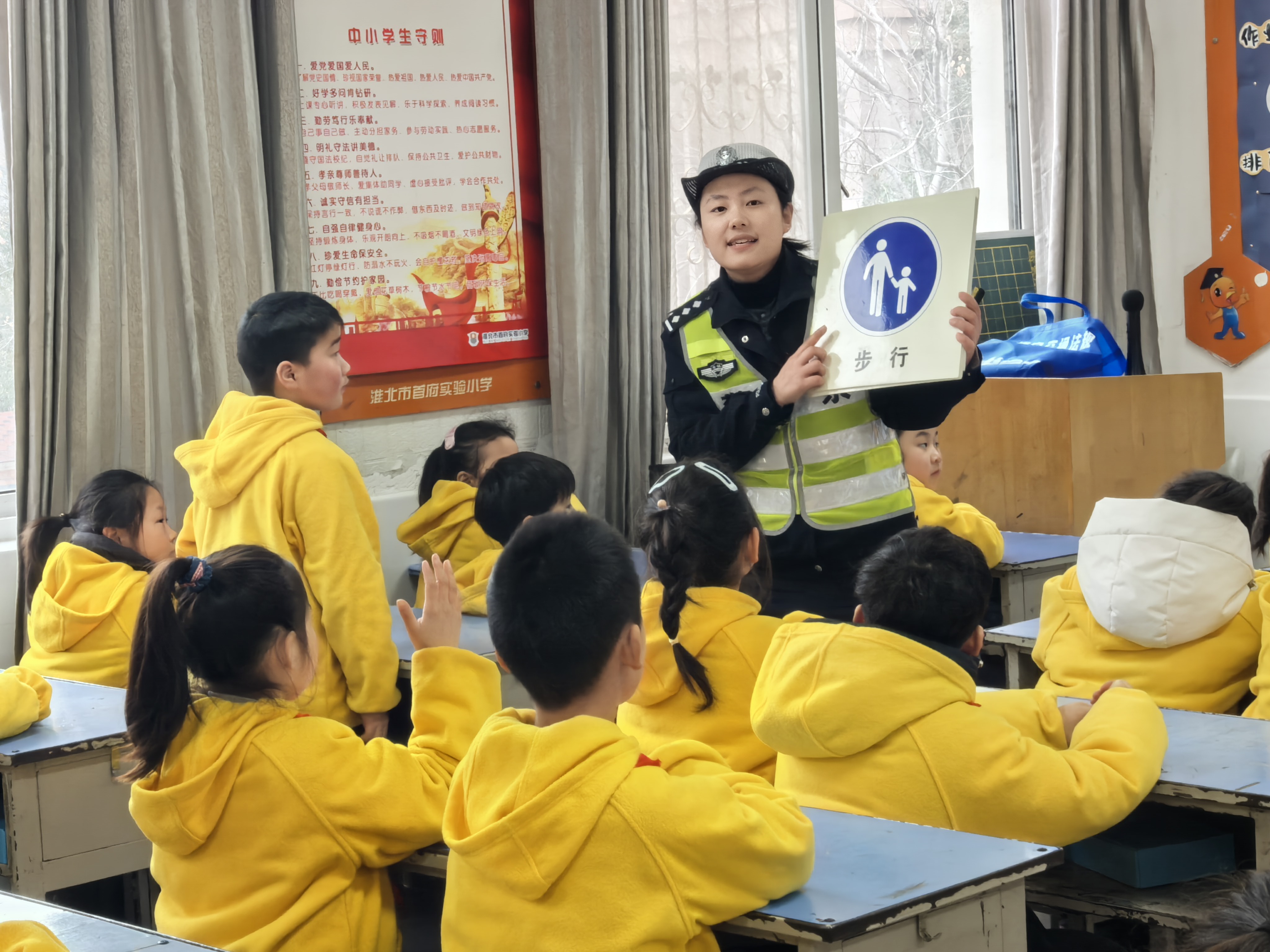 3月4日上午,春季开学首日。淮北市公安局交通管理支队相山大队宣传民警走进首府实验小学,为学生们送上交通安全 “开学第一课”。